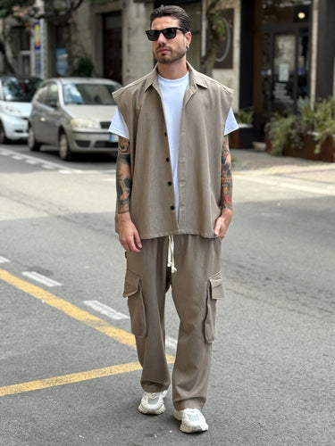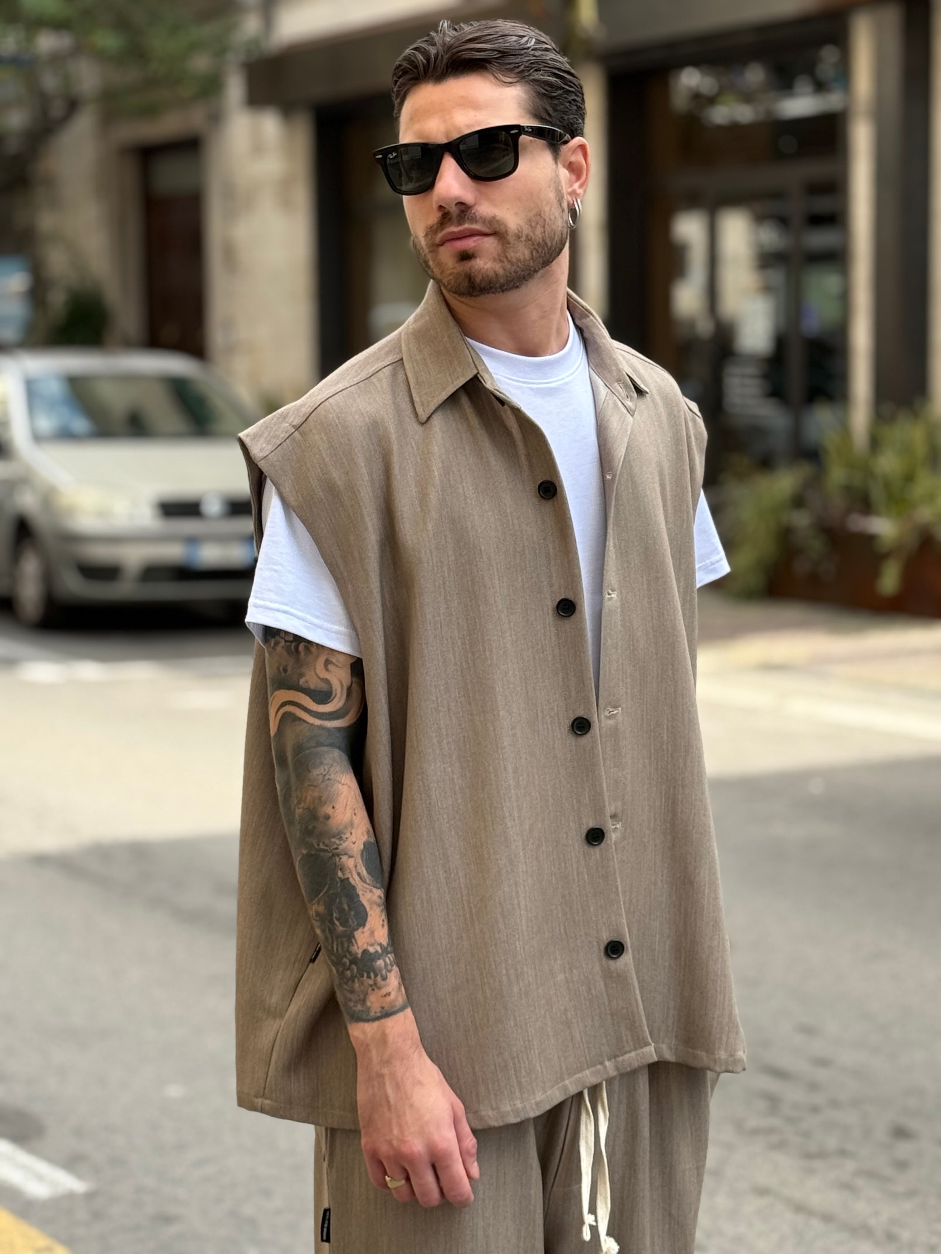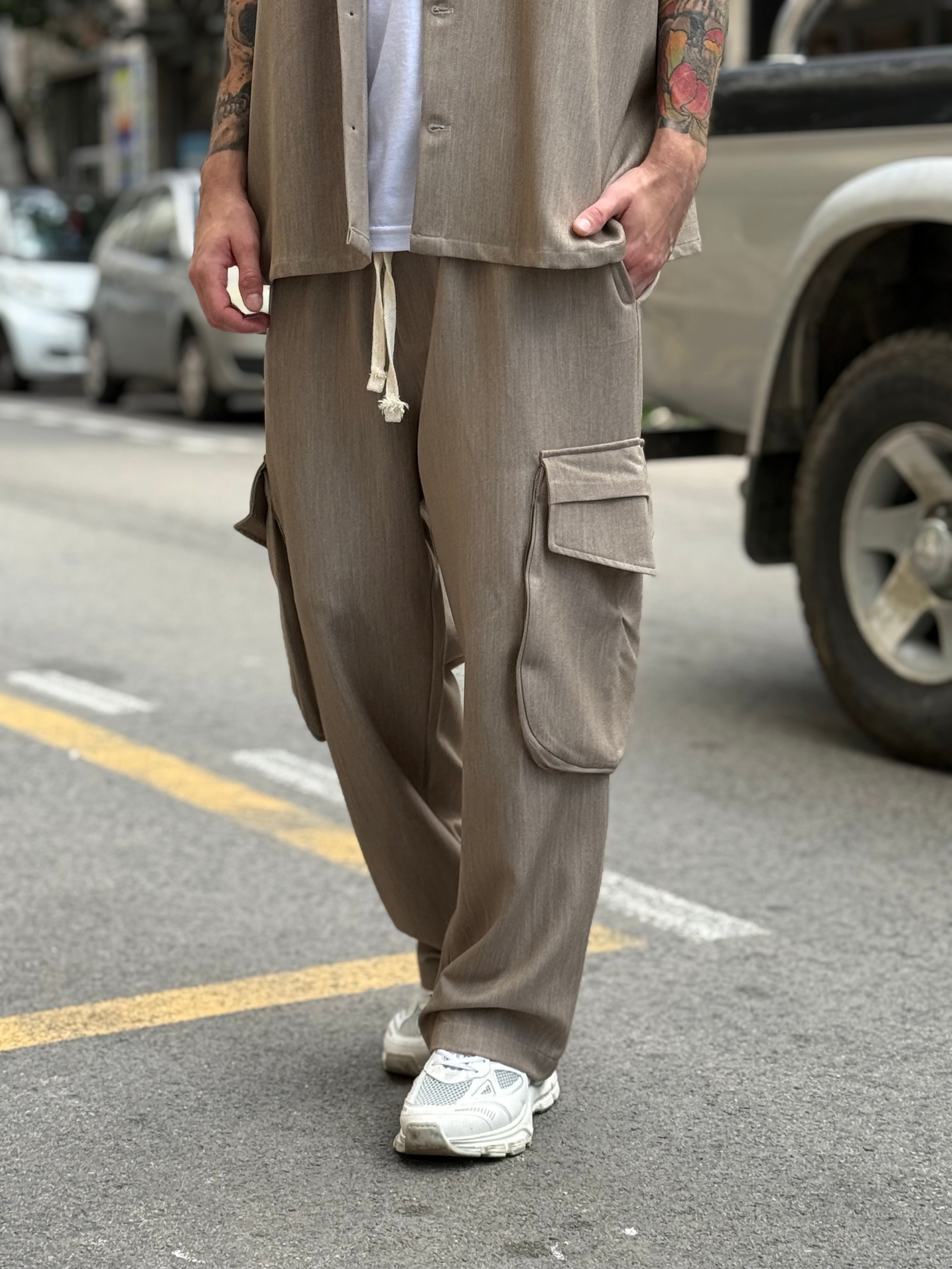 - coordinato smanicato beige , camicione smanicato e pantalaccio con tasconi laterali , fondo ampio Njb