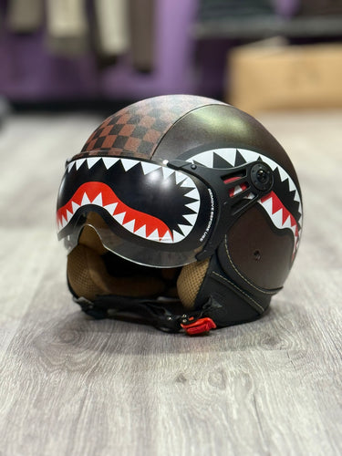 Casco open face unisex in tonalità marrone con grafica “Sharks in Paris” e pattern damier. Visiera trasparente ribaltabile, interni effetto suede beige e chiusura micrometrica regolabile.