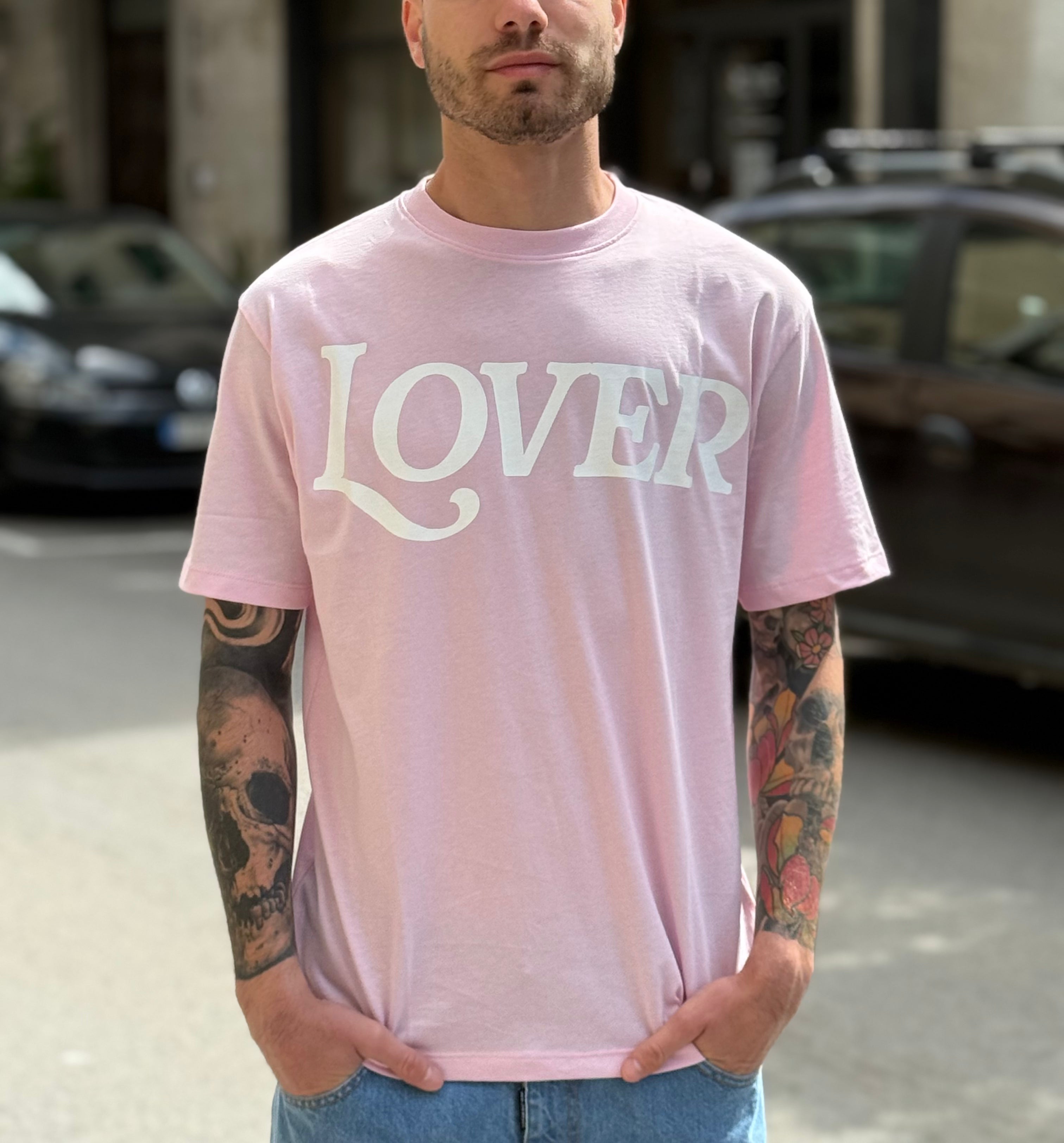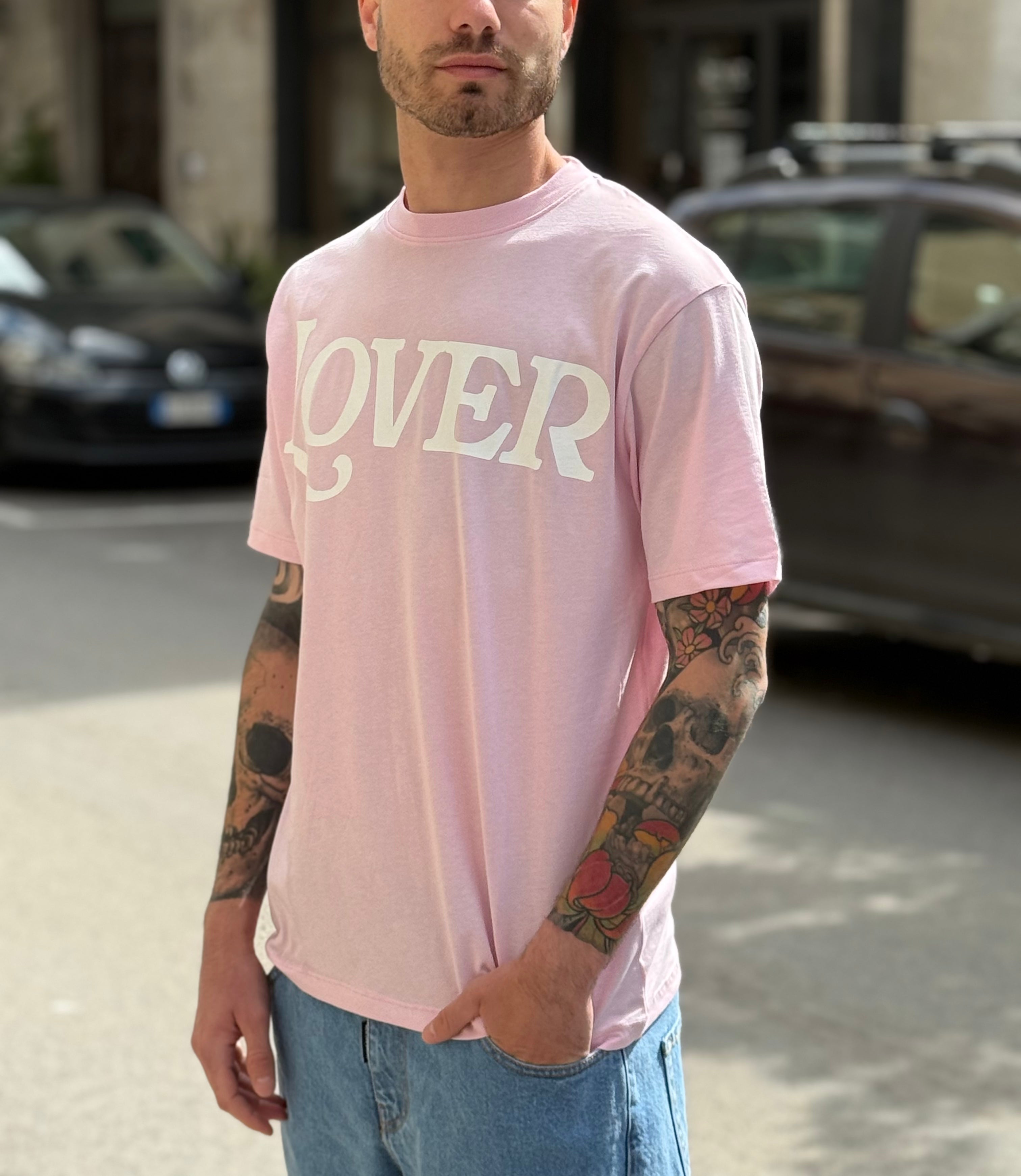 - t shirt rosa con scritta Lover bianca sul davanti Njb