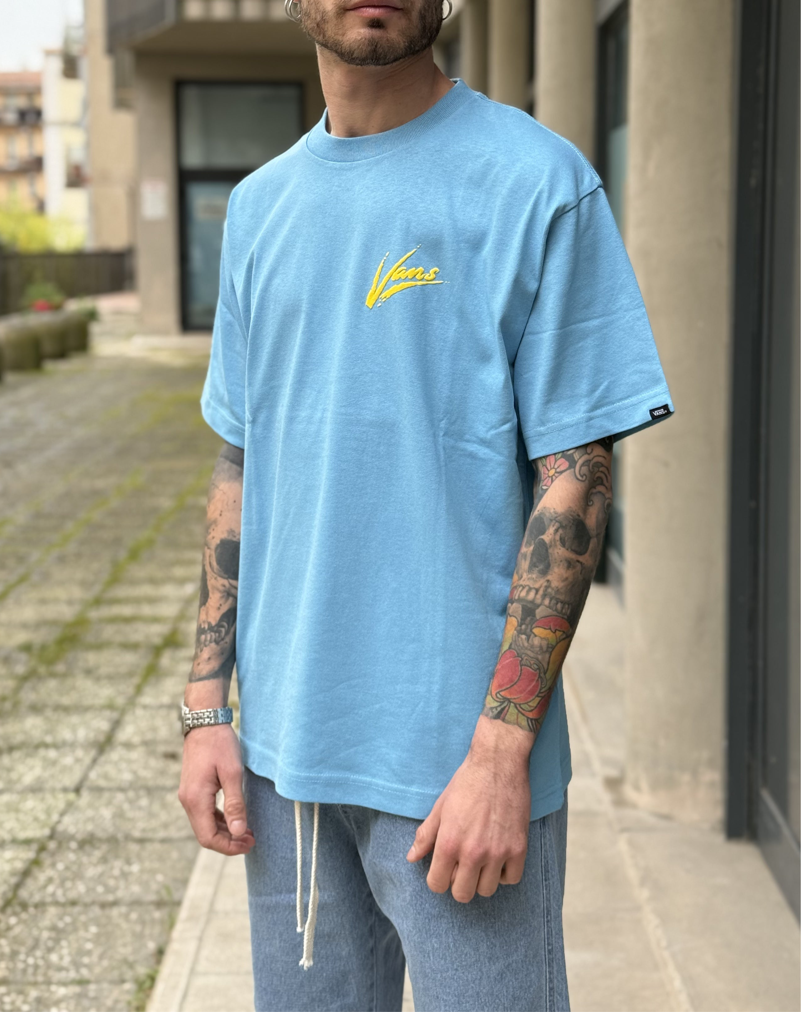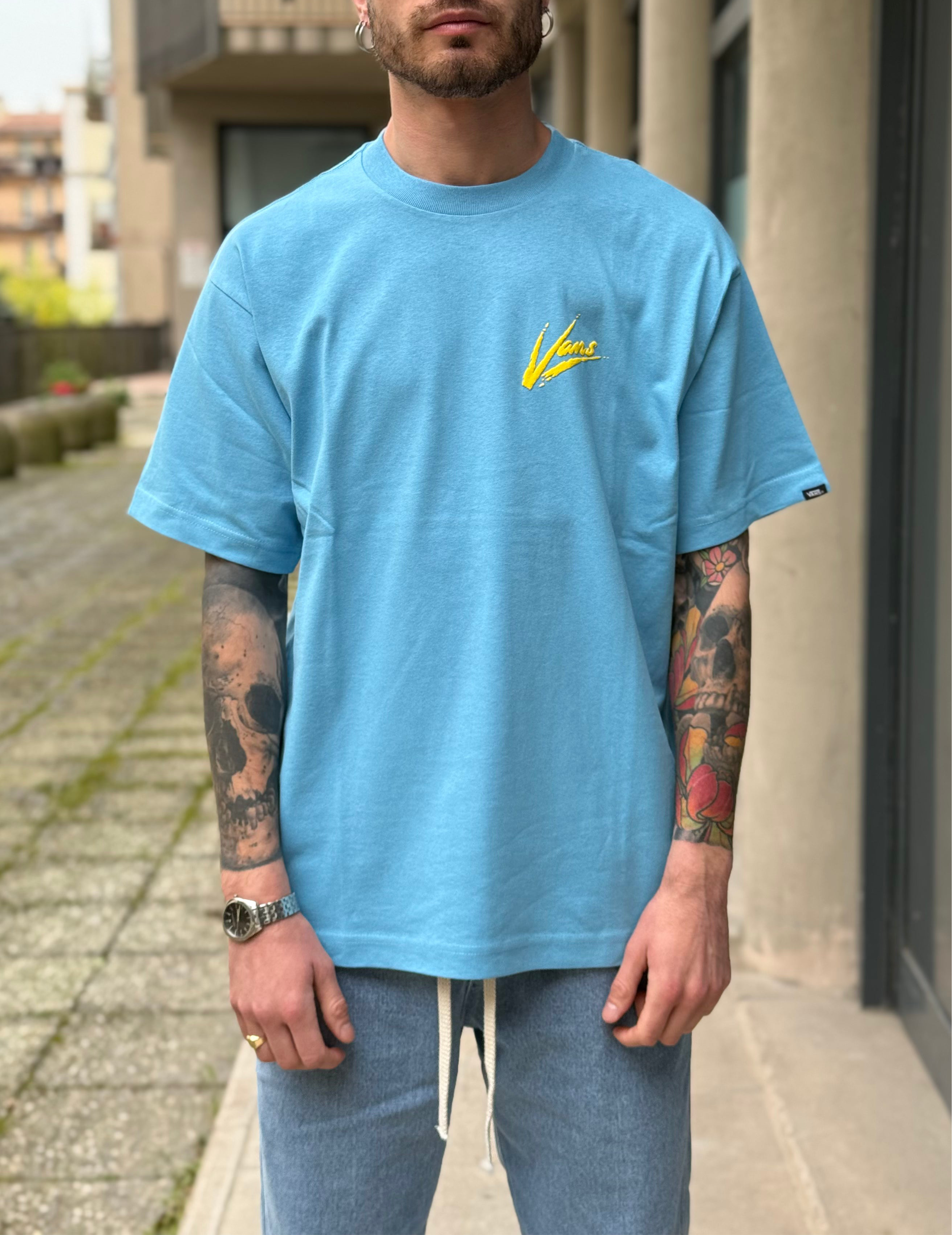 -t shirt celeste con logo dietro Vans