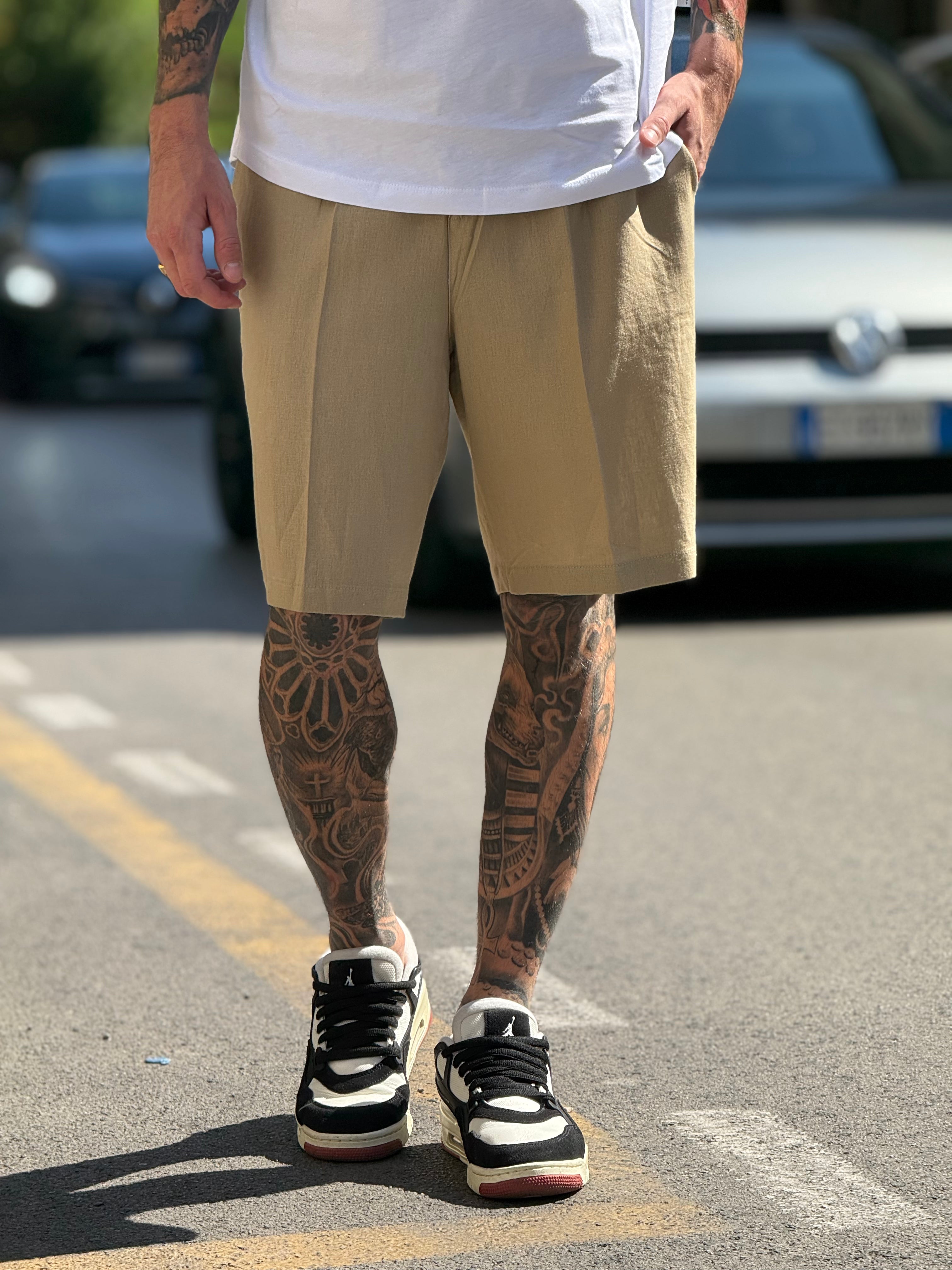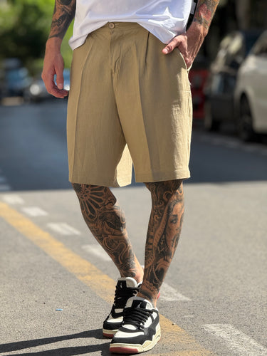 -bermuda Rotem in lino beige con bottone e molla in vita  Njb